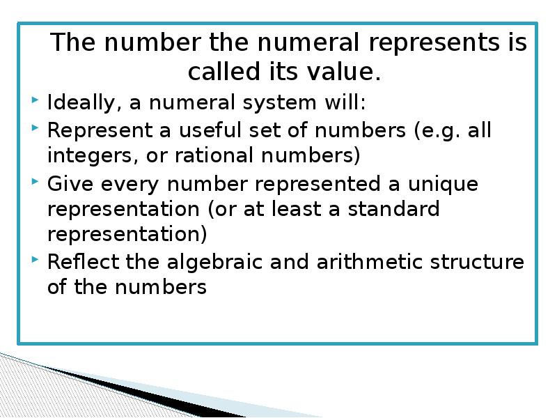 - 3. The number the numeral represents is called its value. The