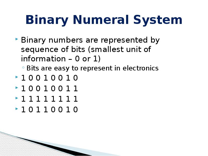 - 6. Binary Numeral System Binary numbers are represented by sequence of bits