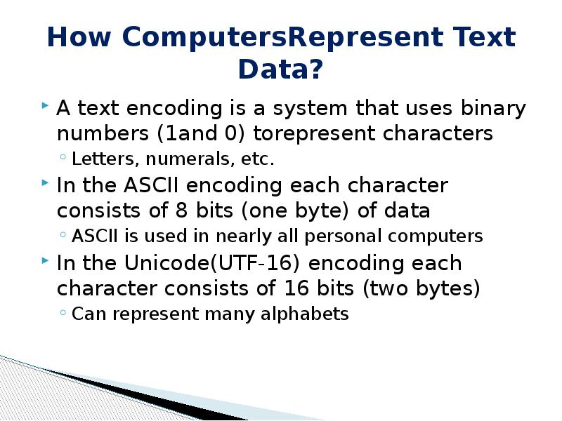 - 8. How ComputersRepresent Text Data? A text encoding is a system that