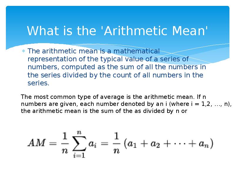 The arithmetic mean is a mathematical representation of the typical value of a series of numbers, computed as the sum of all the numbers in the series divided by the count of all numbers in the series.