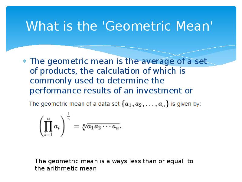 The geometric mean is the average of a set of products, the calculation of which is commonly used to determine the performance results of an investment or portfolio.