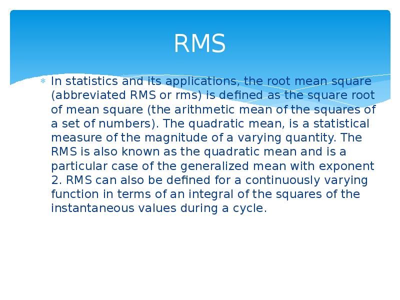 In statistics and its applications, the root mean square (abbreviated RMS or rms) is defined as the square root of mean square (the arithmetic mean of the squares of a set of numbers). The quadratic mean, is a statistical measure of the magnitude of a varying quantity. The RMS is also known as the quadratic mean and is a particular case of the generalized mean with exponent 2. RMS can also be defined for a continuously varying function in terms of an integral of the squares of the instantaneous values during a cycle.