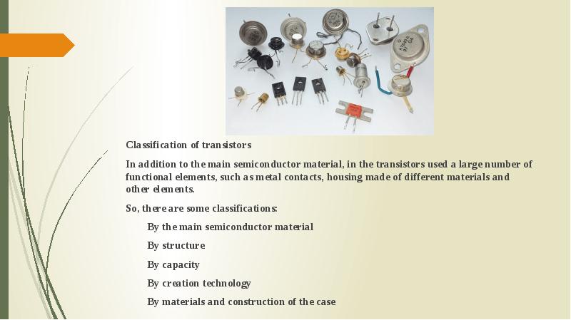 - 6. Classification of transistors Classification of transistors In addition to the main