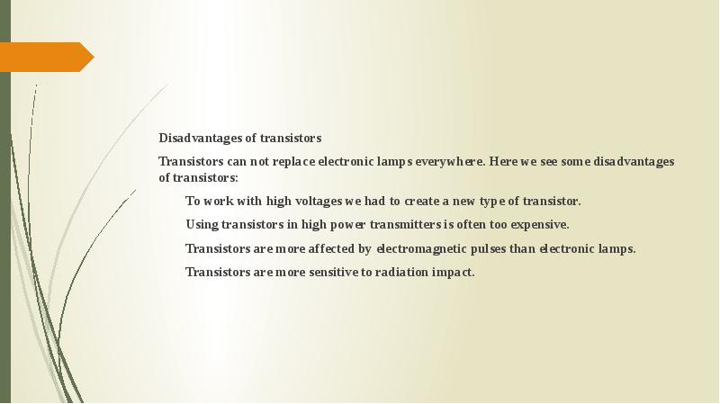 - 9. Disadvantages of transistors Disadvantages of transistors Transistors can not replace electronic