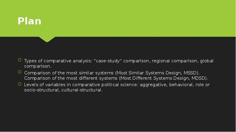 - 2. Plan Types of comparative analysis: "case-study" comparison, regional comparison, global comparison. Comparison of