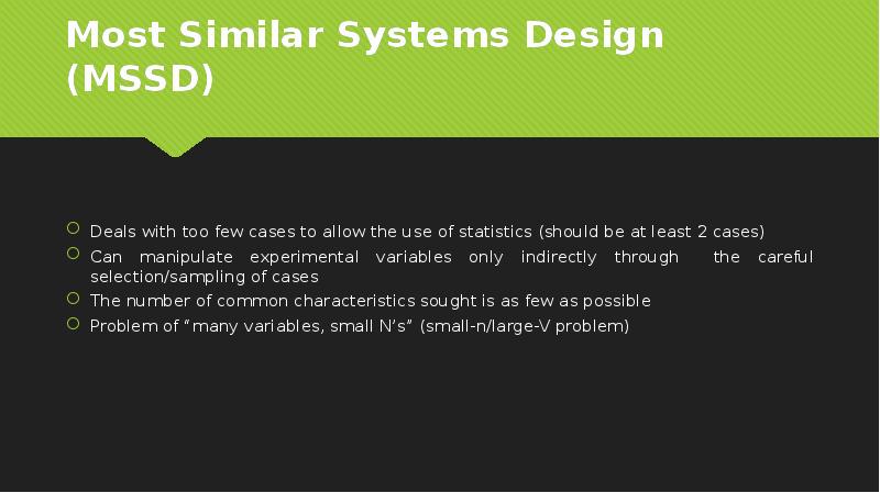 - 14. Most Similar Systems Design (MSSD) Deals with too few cases to