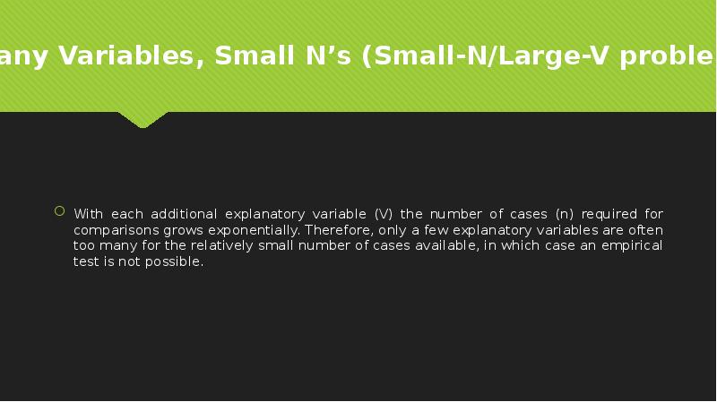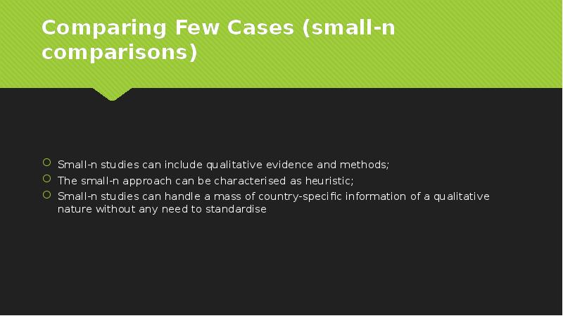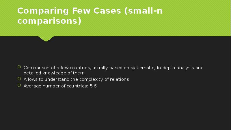 - 9. Comparing Few Cases (small-n comparisons) Comparison of a few countries, usually