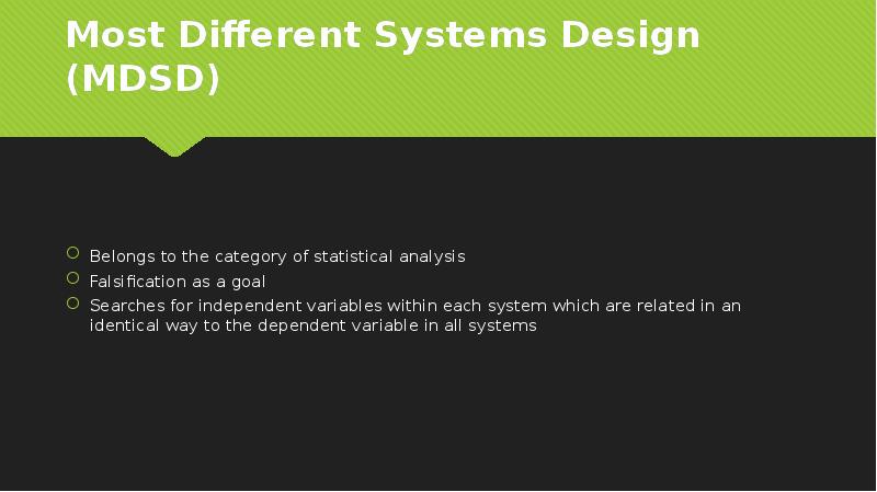 - 16. Most Different Systems Design (MDSD) Belongs to the category of statistical