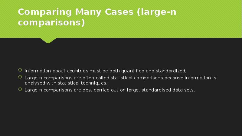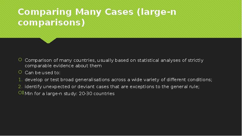 - 7. Comparing Many Cases (large-n comparisons) Comparison of many countries, usually based