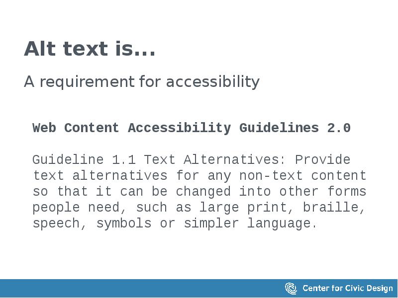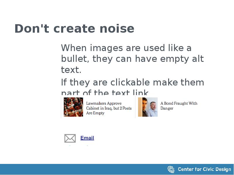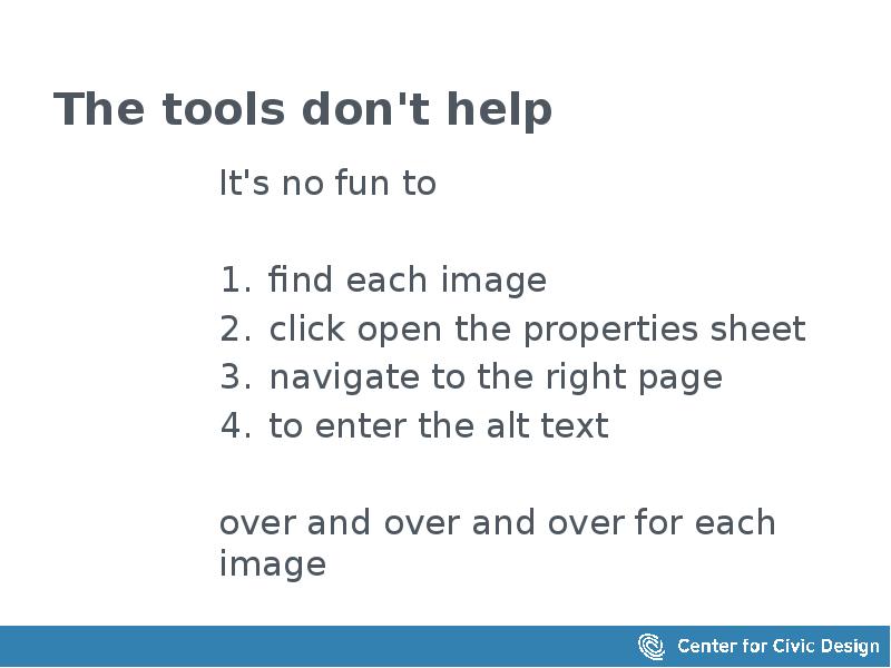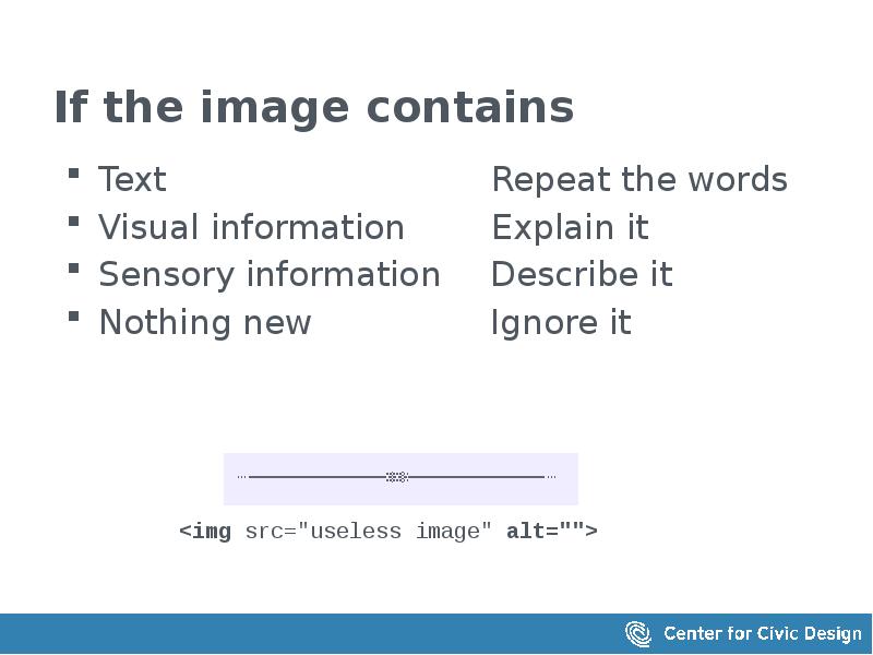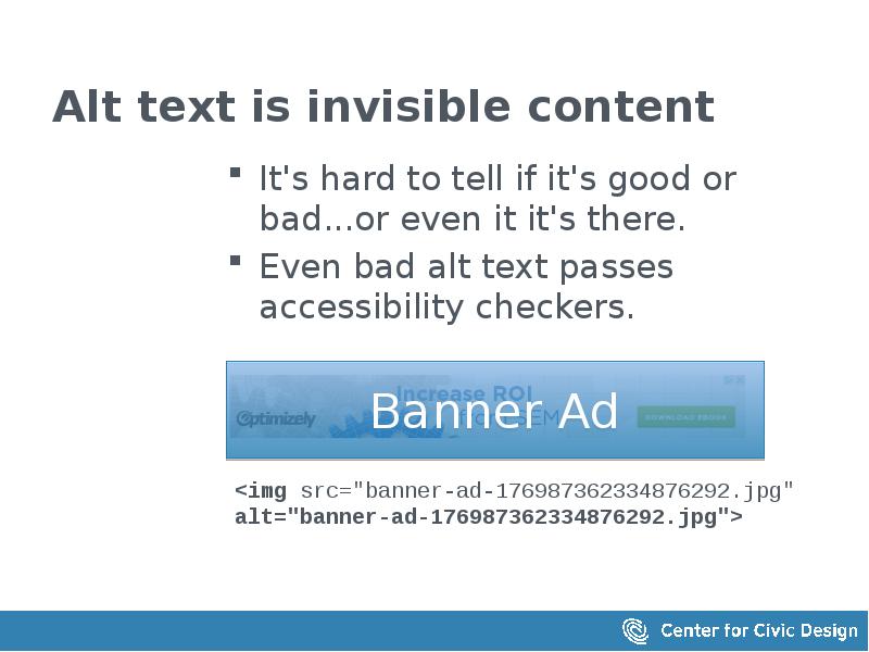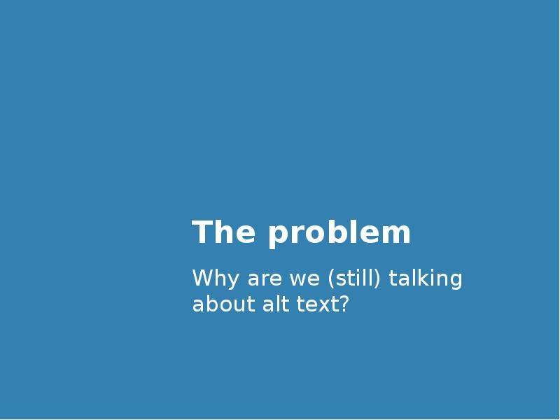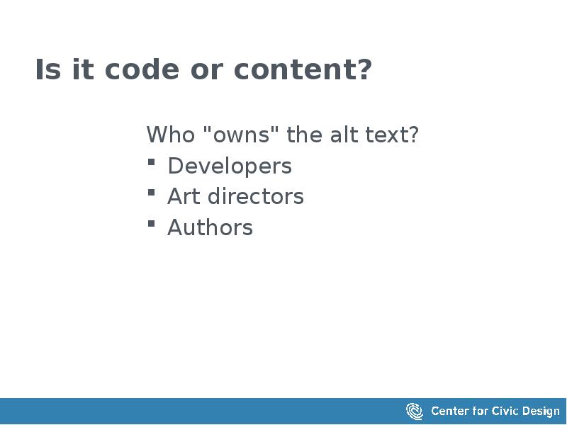 - 11. Is it code or content? Who "owns" the alt text? Developers