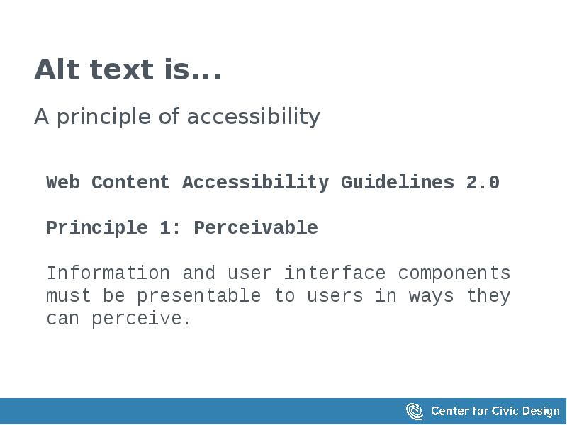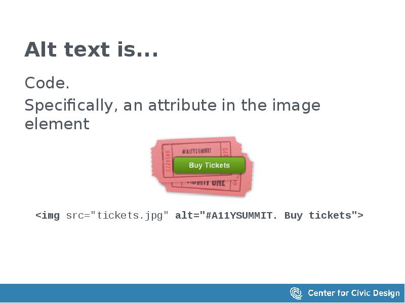- 5. Alt text is... Code. Specifically, an attribute in the image