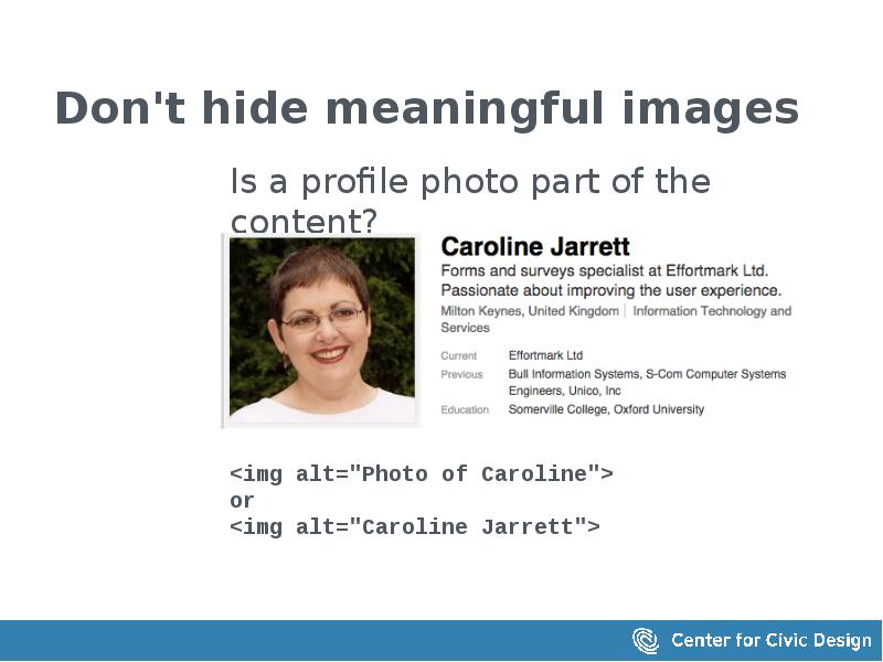 - 31. Don't hide meaningful images Is a profile photo part of the