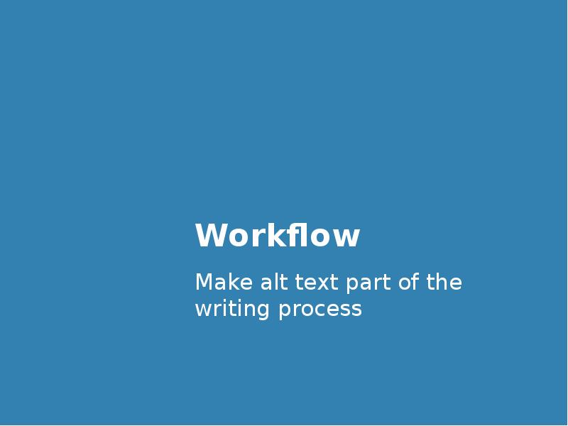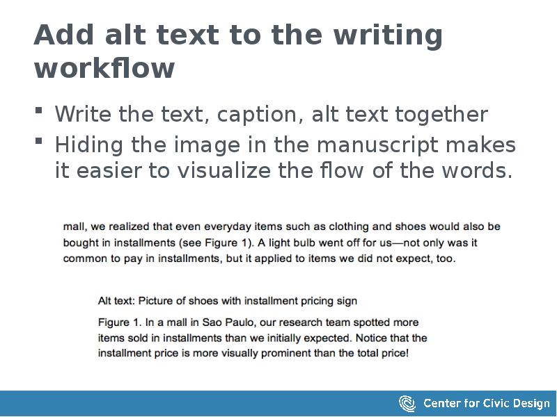 - 43. Add alt text to the writing workflow Write the text, caption,
