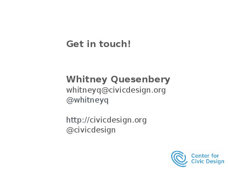 - 47. Get in touch! Whitney Quesenbery [email protected] @whitneyq http://civicdesign.org @civicdesign