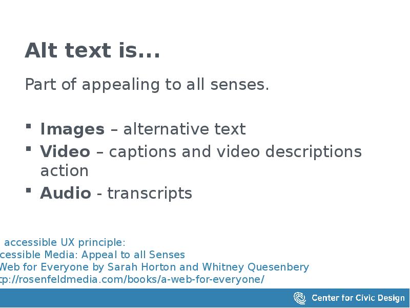 - 6. Alt text is... Part of appealing to all senses. Images –