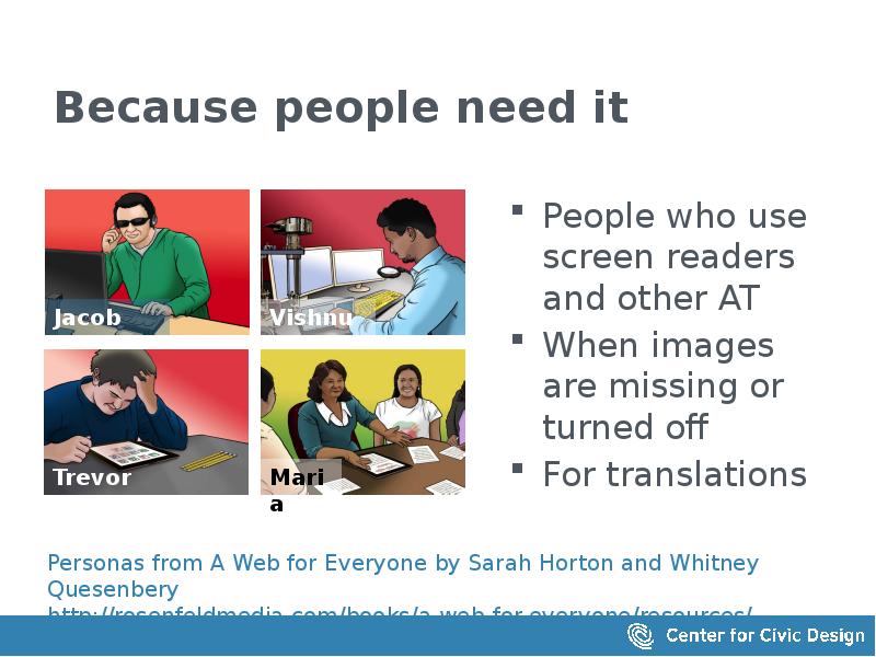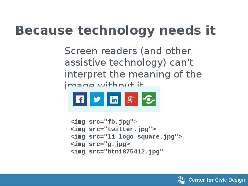 - 7. Because technology needs it Screen readers (and other assistive technology) can't