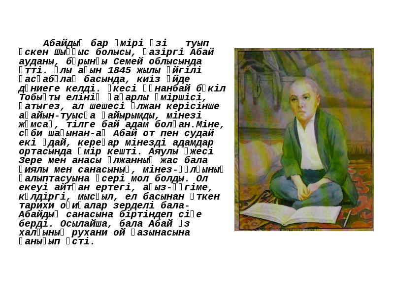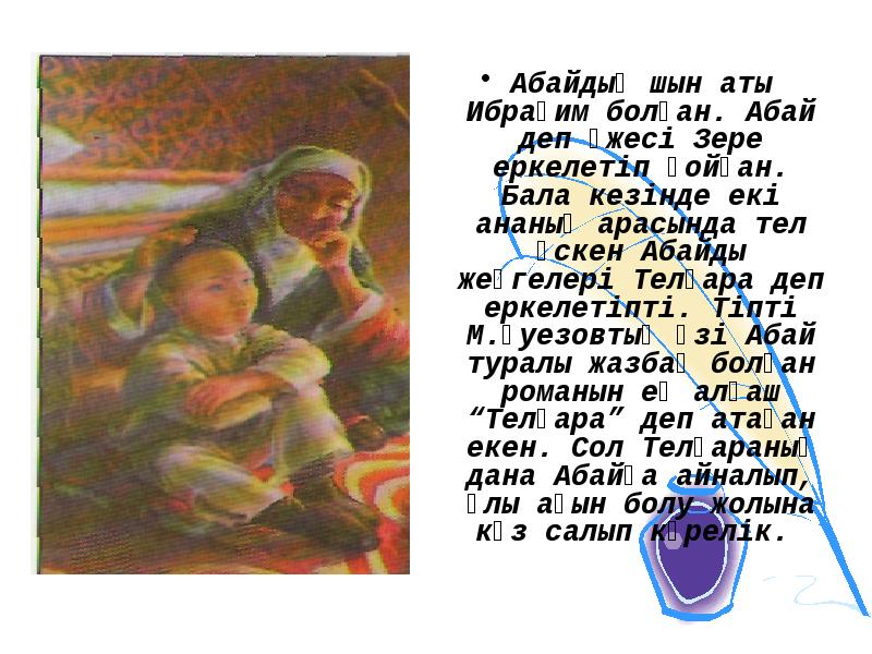 Абайдың шын аты Ибраһим болған. Абай деп әжесі Зере еркелетіп қойған. Бала кезінде екі ананың арасында тел өскен Абайды жеңгелері Т презентация