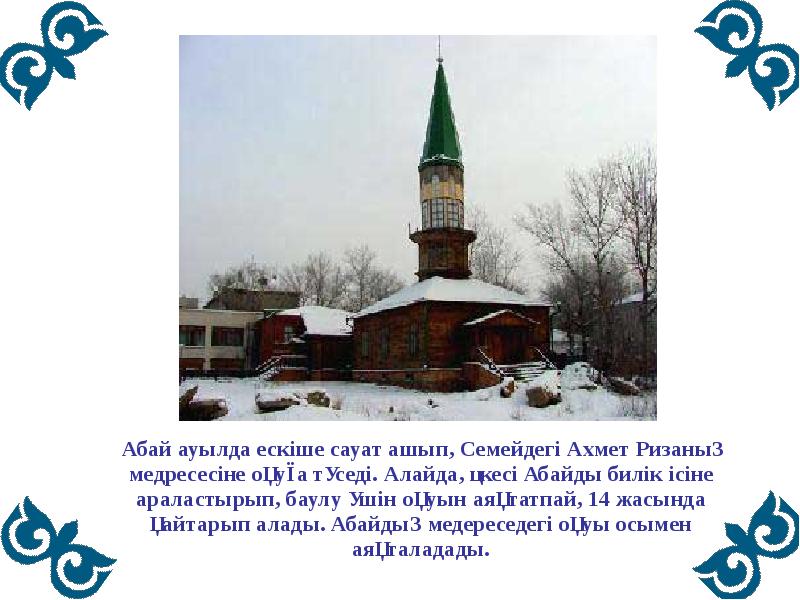 - 4. Абай ауылда ескіше сауат ашып, Семейдегі Ахмет Ризаның медресесіне оқуға түседі.