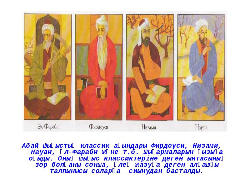 - 5. Абай Шығыстың классик ақындары Фирдоуси, Низами, Науаи, Әл-Фараби және т.б. Шығармаларын
