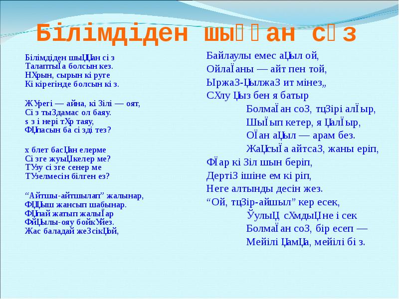 - 10. Білімдіден шыққан сөз Білімдіден шыққан сөз Талаптыға болсын кез. Нұрын,