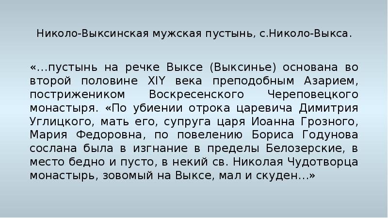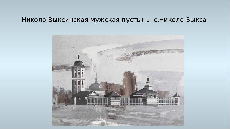 - 12. Николо-Выксинская мужская пустынь, с.Николо-Выкса. «…пустынь на речке Выксе (Выксинье) основана