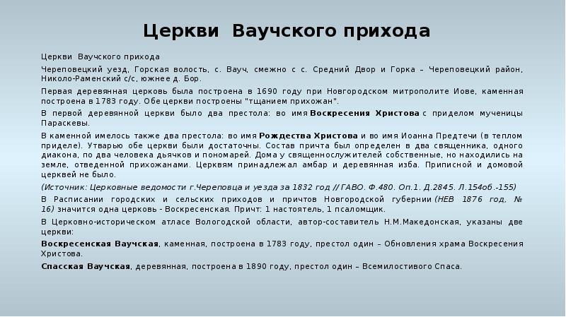- 3. Церкви Ваучского прихода Церкви Ваучского прихода Череповецкий уезд, Горская волость, с. Вауч,