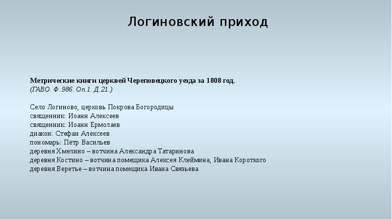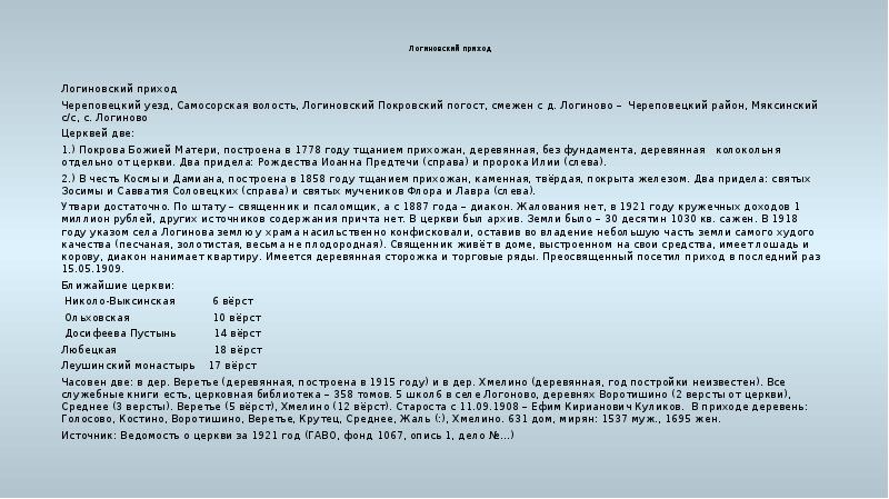 - 31. Логиновский приход Логиновский приход Череповецкий уезд, Самосорская волость, Логиновский Покровский
