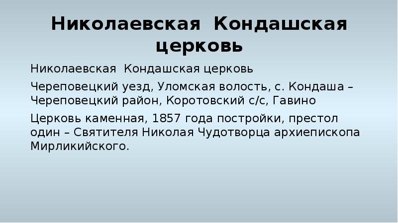 - 33. Николаевская Кондашская церковь Николаевская Кондашская церковь Череповецкий уезд, Уломская волость, с. Кондаша