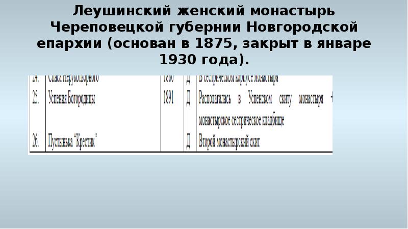 - 43. Леушинский женский монастырь Череповецкой губернии Новгородской епархии (основан в 1875, закрыт