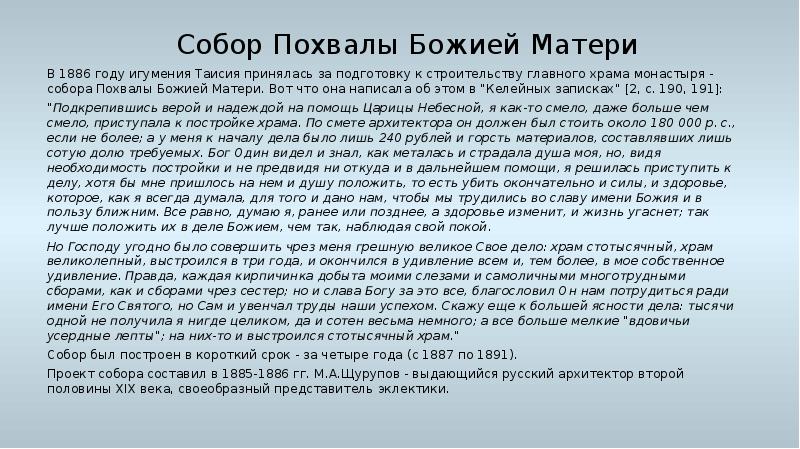 - 47. Собор Похвалы Божией Матери В 1886 году игумения Таисия принялась за