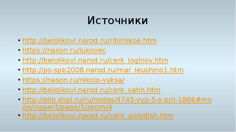 - 58. Источники http://belolikovi.narod.ru/ribinskoe.htm https://nason.ru/lukovec http://belolikovi.narod.ru/cerk_loginov.htm http://ps-spb2008.narod.ru/mar_leushino1.htm https://nason.ru/nikolo-vyksa/ http://belolikovi.narod.ru/cerk_vahn.htm http://elib.shpl.ru/ru/nodes/4745-vyp-5-s-pril-1866#mode/inspect/page/3/zoom/4 http://belolikovi.narod.ru/cerk_gorodish.htm