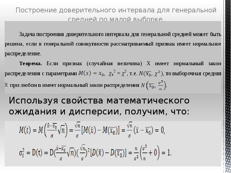 - 11. Используя свойства математического ожидания и дисперсии, получим, что: Построение доверительного