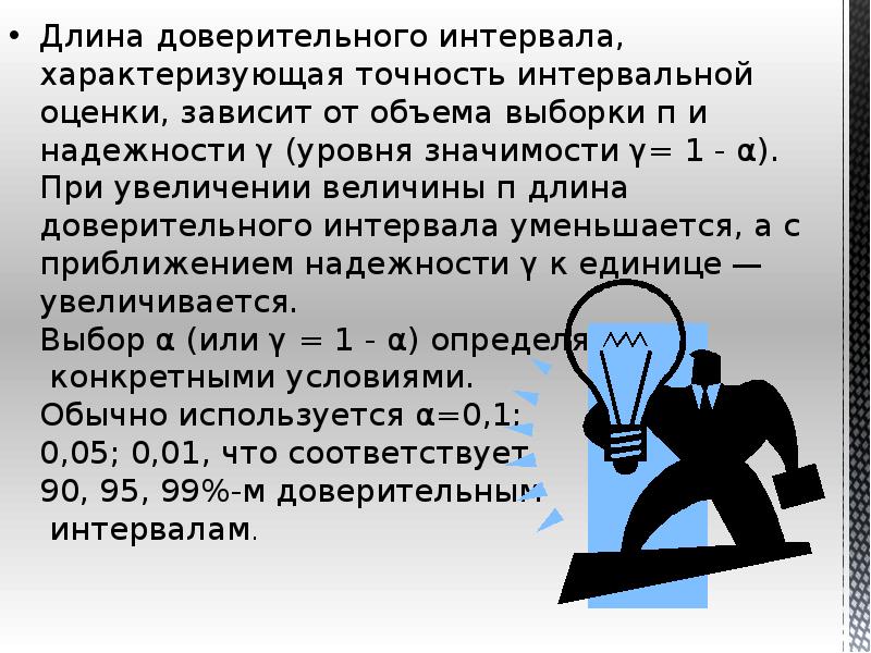 - 5. Длина доверительного интервала, характеризующая точность интервальной оценки, зависит от объема выборки