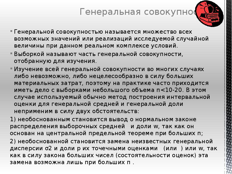 - 10. Генеральной совокупностью называется множество всех возможных значений или реализаций исследуемой случайной