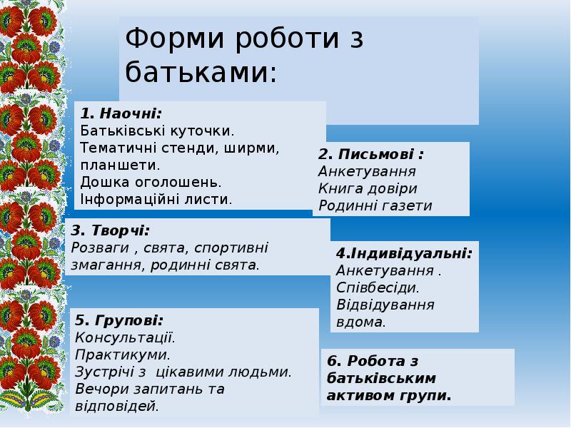 ФОРМИ РОБОТИ З БАТЬКАМИ В КДНЗ №4 «ЧАЙКА» Група «КОЛОСОК» 6р.ж презентация