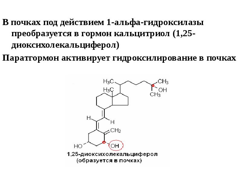 - 22. В печени подвергается микросомальному окислению с образованием 25-ксихолекальциферол, который из печени