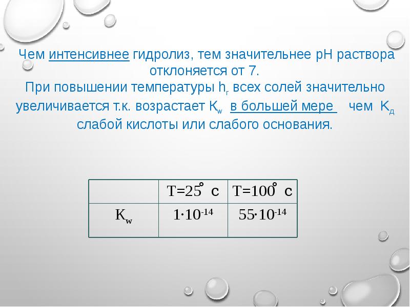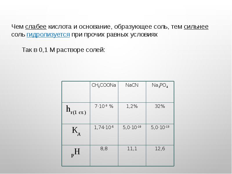 Скачать презентацию на тему Гидролиз. Константа и степень гидролиза. рН растворов гидролизующих солей можно ниже: