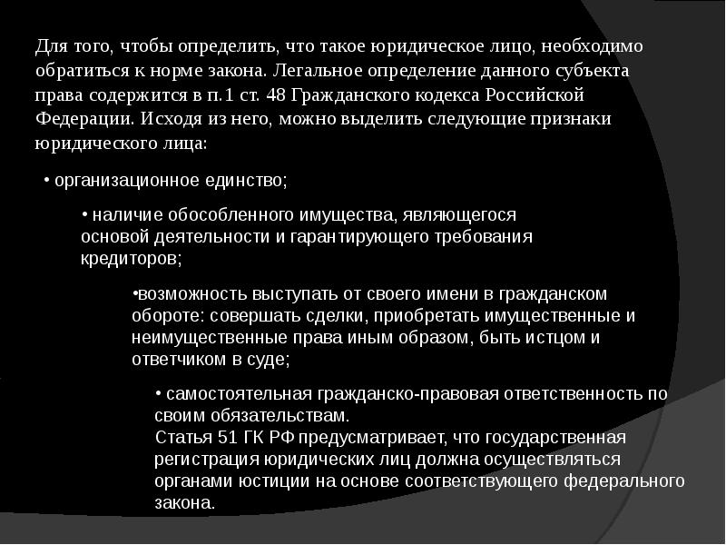 - 2. Понятие юридического лица Юридическое лицо — организация, которая имеет обособленное имущество и отвечает им