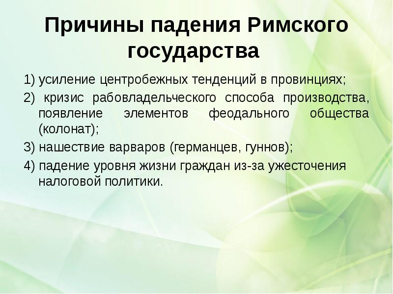 - 22. Причины падения Римского государства 1) усиление центробежных тенденций в провинциях;