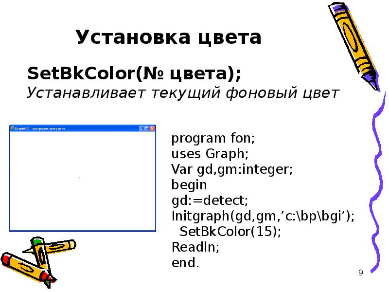 Program pr; Program pr; Uses graph; {использование графического режима} Var gd, {графический драйвер} gm:integer; {графический режим} Begin gd:=detect; {автораспознавание драйвера} Initgraph(gd, gm,’путь к файлу egavga.bgi’); {операторы и процедуры графических построений} Readln; Closegraph; End.