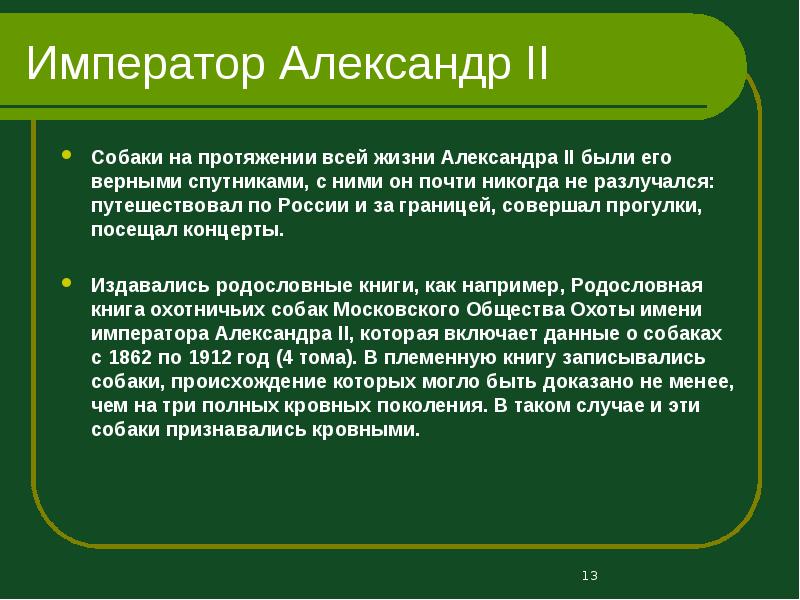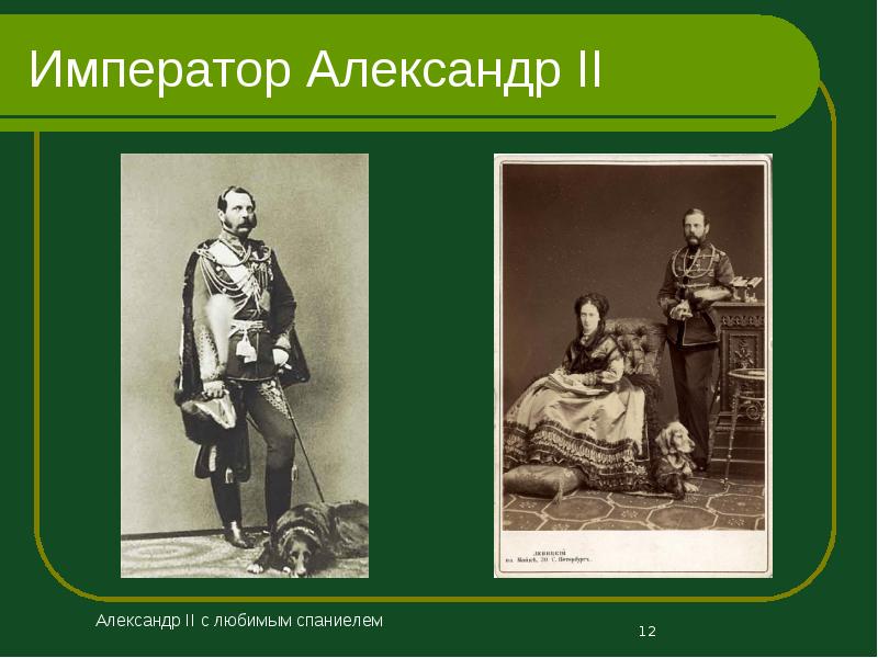 - 13. Император Александр II Собаки на протяжении всей жизни Александра II были