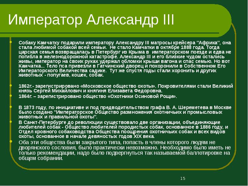 - 15. Император Александр III Собаку Камчатку подарили императору Александру III матросы крейсера "Африка", она стала