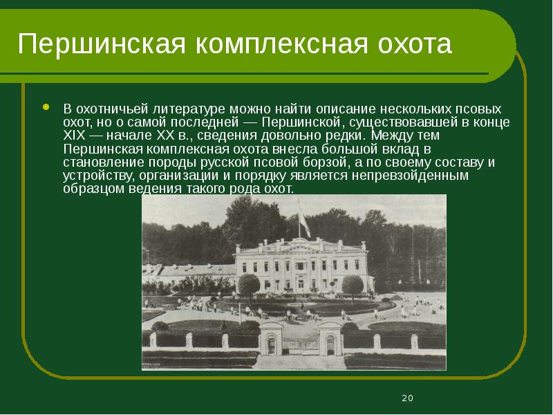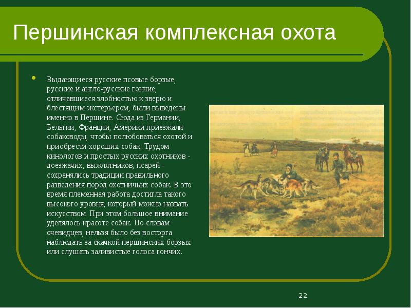 - 20. Першинская комплексная охота В охотничьей литературе можно найти описание нескольких псовых
