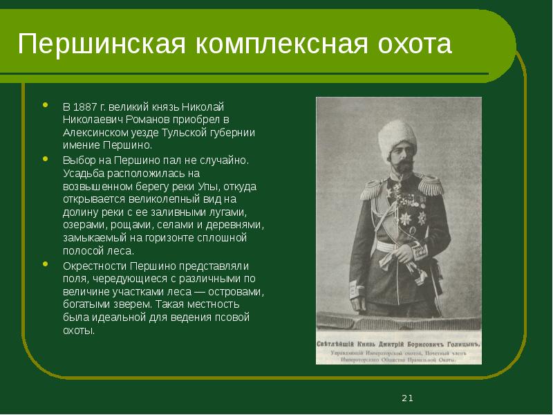 - 21. Першинская комплексная охота В 1887 г. великий князь Николай Николаевич Романов