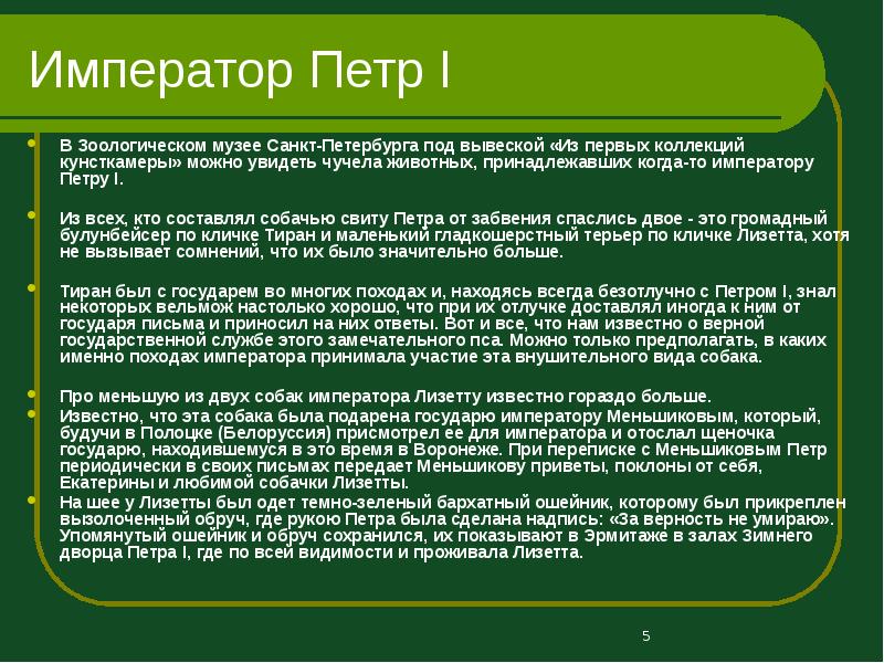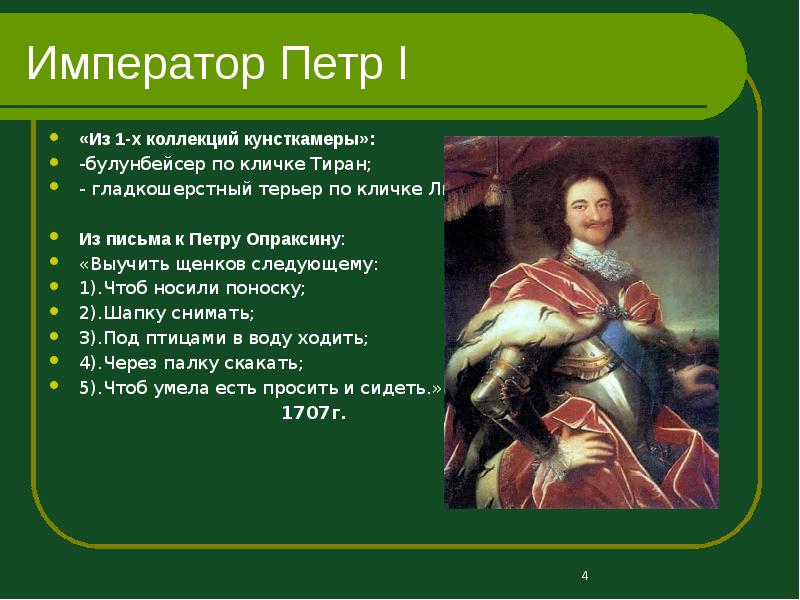 - 4. Император Петр I «Из 1-х коллекций кунсткамеры»: -булунбейсер по кличке Тиран;