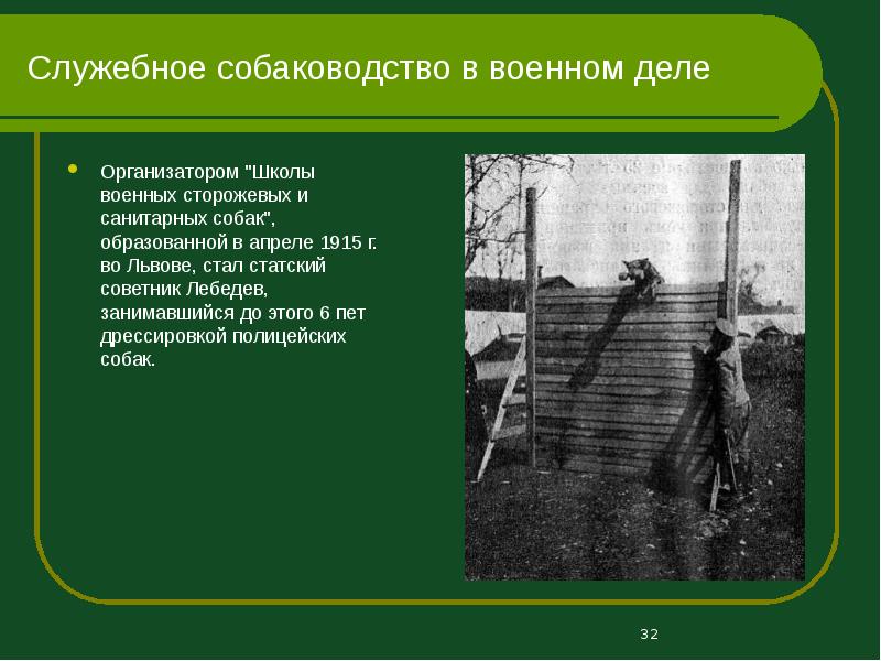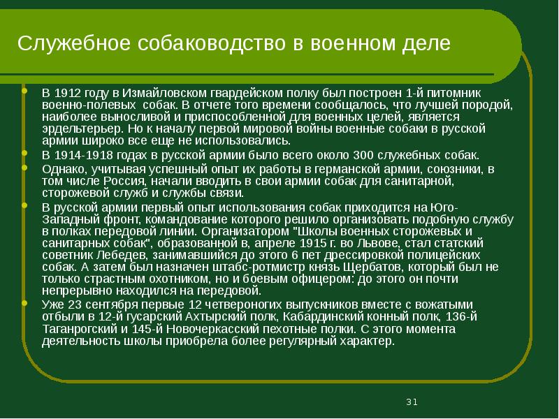 - 31. Служебное собаководство в военном деле В 1912 году в Измайловском гвардейском