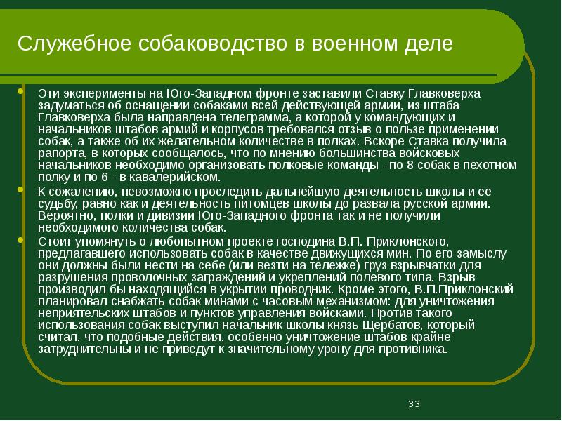 - 33. Служебное собаководство в военном деле Эти эксперименты на Юго-Западном фронте заставили