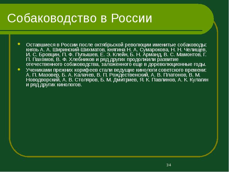 - 34. Собаководство в России Оставшиеся в России после октябрьской революции именитые собаководы: