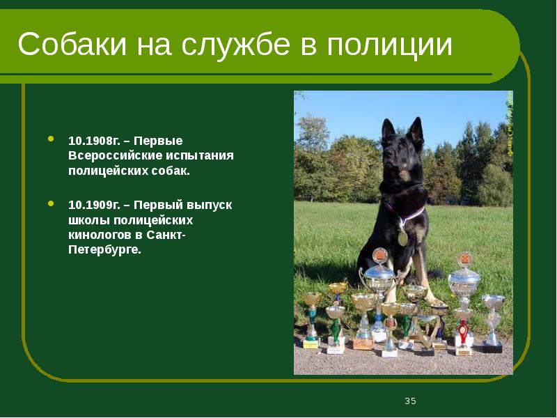 - 35. Собаки на службе в полиции 10.1908г. – Первые Всероссийские испытания