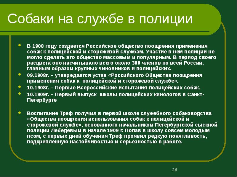 - 36. Собаки на службе в полиции В 1908 году создается Российское общество